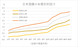 グラフは日本国債の年限別にみた利回りの水準だ(イールドカーブと呼ばれる)。超長期の40年国債の利回りが一時、初めて4%を超えた1月20日と、その1年前、2年前と比べている。ついでに、「責任ある積極財政」を唱える高市内閣が発足した2025年10月21日のカーブ(点線)も付け加えてみた。どの年限も利回りは上昇しているが、期間10年以上の上げが際立っている。